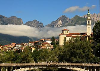 Above Calalzo di Cadore you walk towards Tai di Cadore and continue to Valle di Cadore. Here we recommend a short detour to the church of St. Martin in Valle di Cadore. Continue along the hiking trail “Cammino delle Dolomiti” and hike to the train station Perarolo at the foot of Monte Zucco. From here you take the train to today‘s stage destination Belluno “The small Venice in the mountains”. (Train ticket not included in the price.)