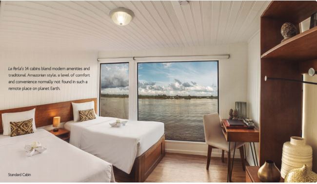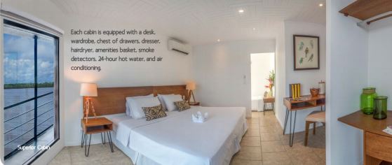 14 cabins in total. Nine standard cabins, two Amazon View cabins and three superior cabins. All suites include air conditioning, twin beds convertible to a king size (or double bed), desk, wardrobe, chest of drawers, hair dryer, private bathroom with shower, smoke detectors and hot water 24 hours a day.