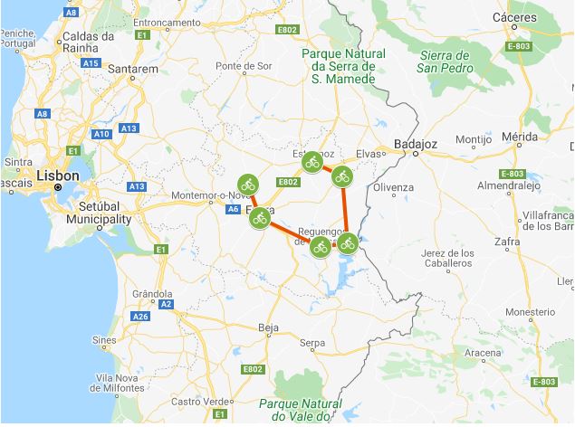 The Castles and Wine bike tour will live up to its name.  Most nights will be spent either in a castle or an old convent, now beautiful charming hotels.  Along the way the great ancient city of Évora, world heritage site, and small fortified hamlets will tell the stories of wars with moors and Spain. The border is right there on the other side of Alqueva, the biggest artificial lake in Europe.  The loveable Alentejo people, at first shy, the Mediterranean typical gastronomy along with the wonders of cork, marble, olive oil and other crafts will enrich your experience. And the wine… well come and judge for yourself…  All this in safe backroads with some easy bits off the asphalt riding, with us by your side.