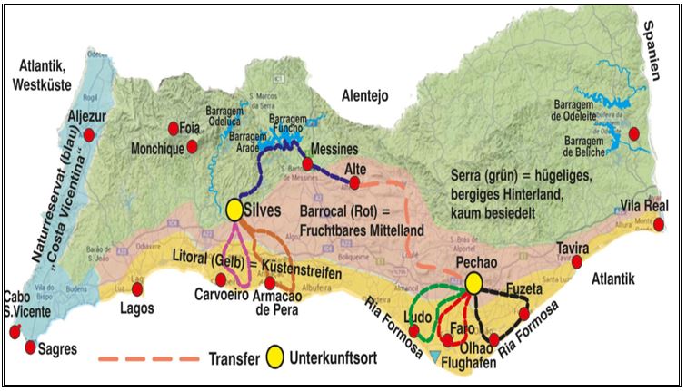 Variety is on the program! Flat in the east, with miles of fine sandy beaches, steep and rocky in the west, with spectacular rock formations and beautiful bathing bays. In the middle the nature reserve "Ria Formosa", an extensive lagoon area with many waterways and dune islands. A refuge for rare species of birds and marine animals. Large mussel basins alternate with the huge salt fields from which the famous “Flor de Sal” originates. On this bike tour you will experience the varied coastal area and the fertile plateau, the "Barrocal", the fruit and vegetable garden, as this area is also called. Not to forget the untouched, sparely inhabited hilly hinterland, where it seems that time has stood still. In addition to local attractions, the eventful history of this country also offers many secrets to discover. The regional cuisine, with the numerous dishes with fish or fresh seafood, ensures the culinary delights. Discover the many secrets of this region.